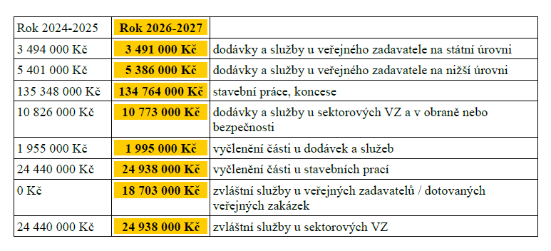 Od 1. ledna 2026 dochází k úpravě finančních limitů pro nadlimitní veřejné zakázky. Změny budou platné pro období 2026–2027 a vycházejí z pravidelné revize limitů podle evropské legislativy.